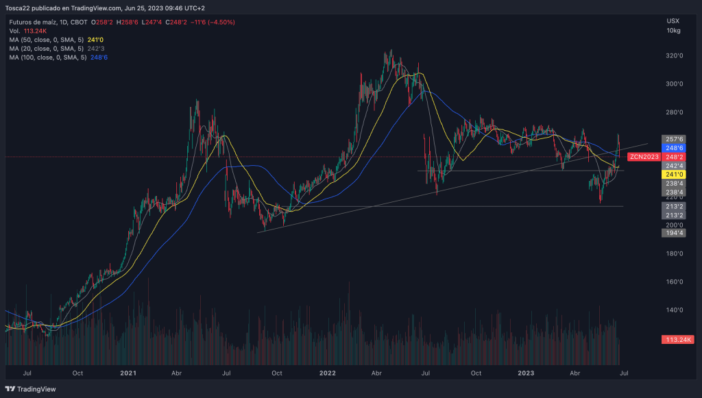 El maíz vemos que se colocó por encima de la linea de tendencia alcista, llegó hasta los 264 USD y luego retrocedió otra vez por debajo de la línea llegando hasta los 264 USD. Tiene dos soportes, uno en 245 USD y otro en 238 USD. Es clave que mantenga este último sino lo podremos volver a ver en 213 USD.