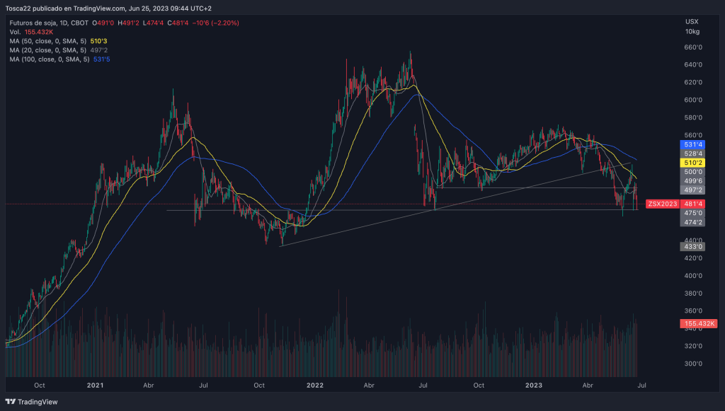 La soja, luego de la fuerte caída, tuvo un rebote hasta los 500 USD en donde se encuentra la resistencia la cual no logró superar. Ahora se encuentra otra vez en el soporte de 475 USD que en el caso de perforarlo podremos ver el precio en los 440 USD.