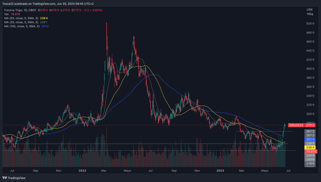 El trigo tuvo un fuerte impulso alcista luego de temores por el clima en China, el principal productor de trigo en el mundo. En esta semana vemos que logró llegar hasta los 280 USD superando la resistencia de los 261 USD. Podríamos esperar a que retroceda al nivel de 261 USD en el corto plazo y confirmar el nuevo soporte. En el caso de seguir subiendo, primero debe superar la resistencia de 280 USD para poder llegar hasta los 297 USD.