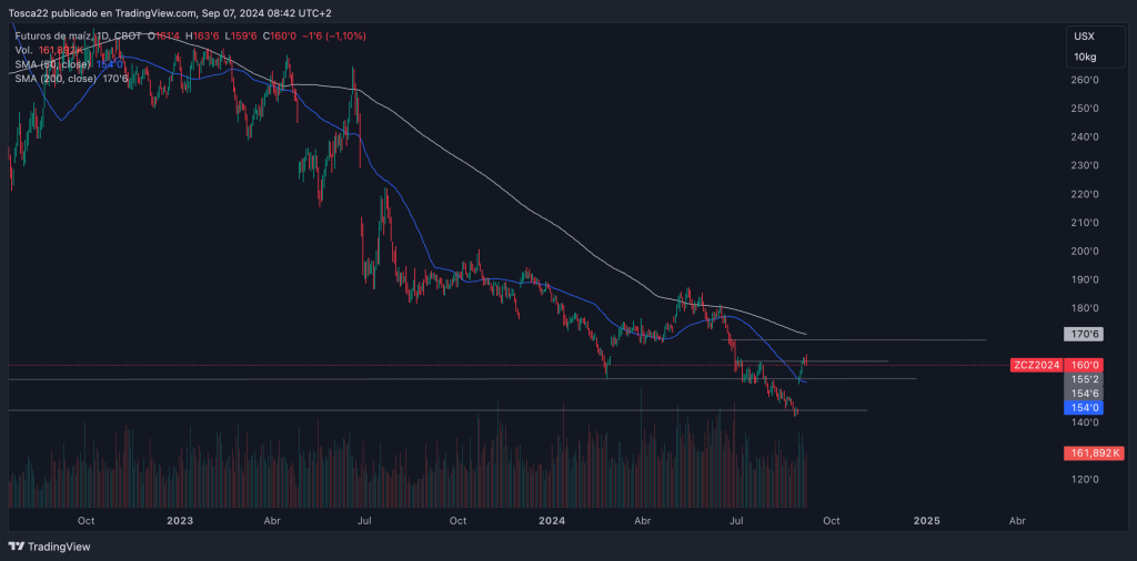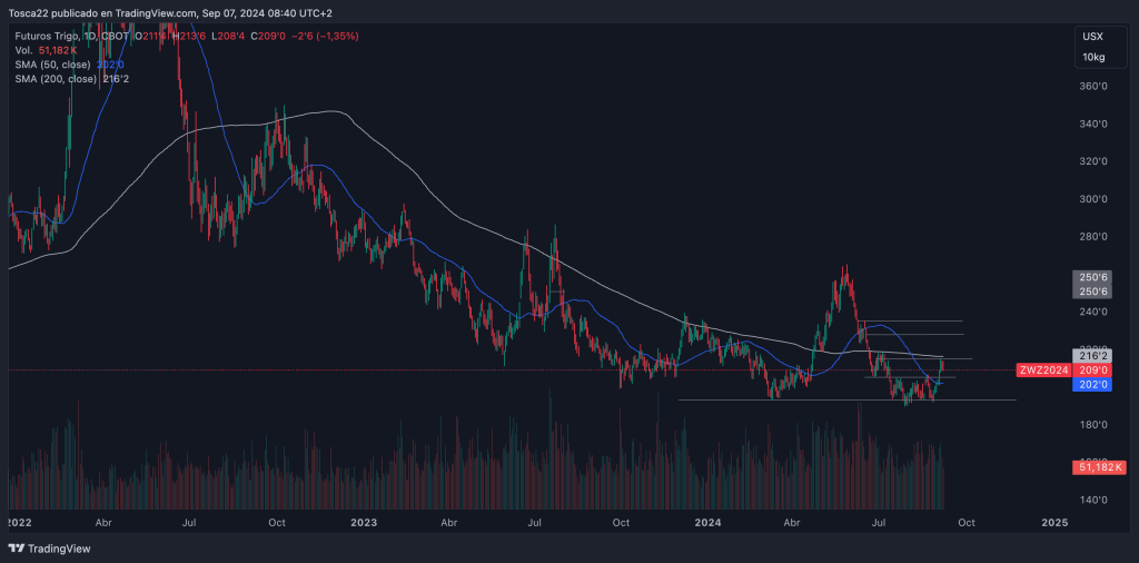 El trigo en Chicago, como podemos observar, ha hecho un piso en los 193 USD y actualmente está intentando superar la resistencia de 215 USD. Si logra superarla, podría señalar un cambio de tendencia, con los siguientes objetivos a superar en 228 USD y 235 USD, respectivamente.