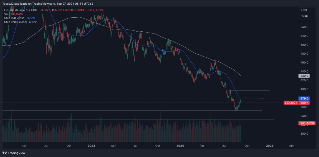 La soja en Chicago rebotó en los 351 USD y ahora se encuentra en la resistencia de 379 USD. En caso de superar este nivel, el siguiente objetivo será de 397 USD. Si no logra superarlo, podría volver al soporte de 351 USD. De regresar a este soporte y perforarlo, el siguiente soporte se encuentra en la zona de 330 USD.