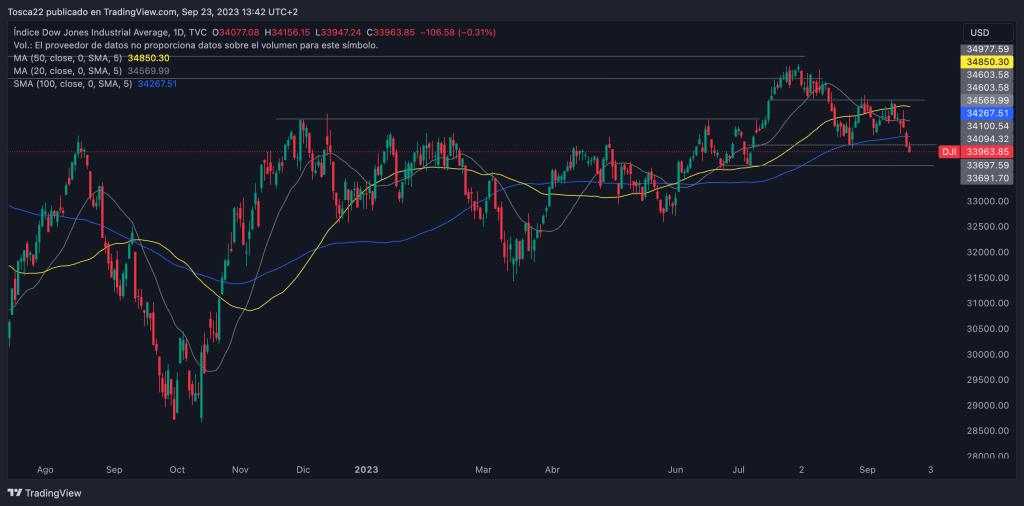 El índice Dow Jones ha perforado el soporte de 34,095 puntos. En el caso de que logre recuperarlo de manera inmediata, mostrará fortaleza en ese nivel de soporte. Sin embargo, si no lo logra, es probable que continúe descendiendo hasta el primer objetivo en los 33,700 puntos.