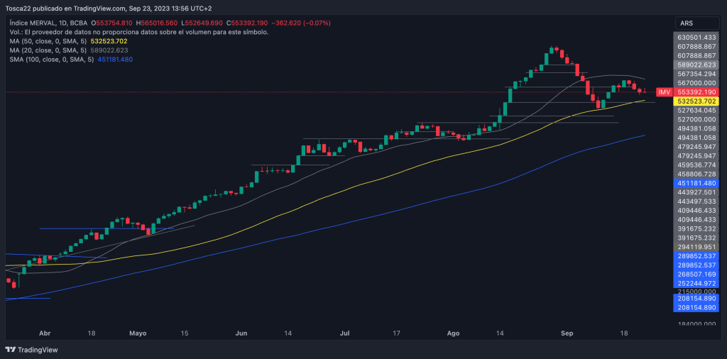 El índice Merval en pesos no logró superar la resistencia en los 567,000 puntos y parece dirigirse hacia el soporte en los 527,000 puntos. Si el índice rebota en este nivel, la resistencia de 567,000 puntos seguirá siendo un objetivo. Sin embargo, si el soporte se rompe, podríamos ver una continuación de la caída hacia los 494,381 puntos.