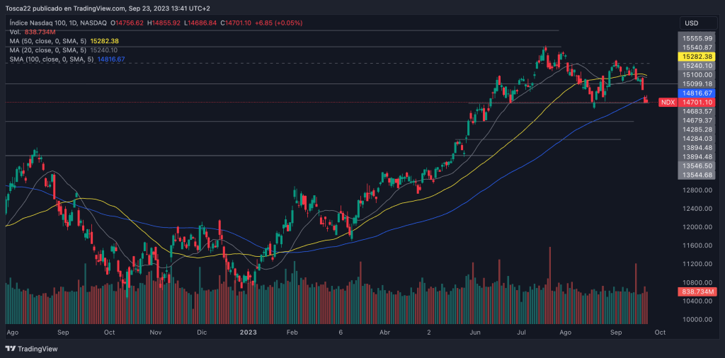 El índice Nasdaq 100 se encuentra actualmente en el soporte de los 14,688 puntos. Si logra mantenerse por encima de este nivel, su próxima resistencia se encuentra en los 15,102 puntos. Sin embargo, si el índice rompe por debajo del soporte, los siguientes niveles de soporte se ubican en los 14,282 puntos y 13,894 puntos.