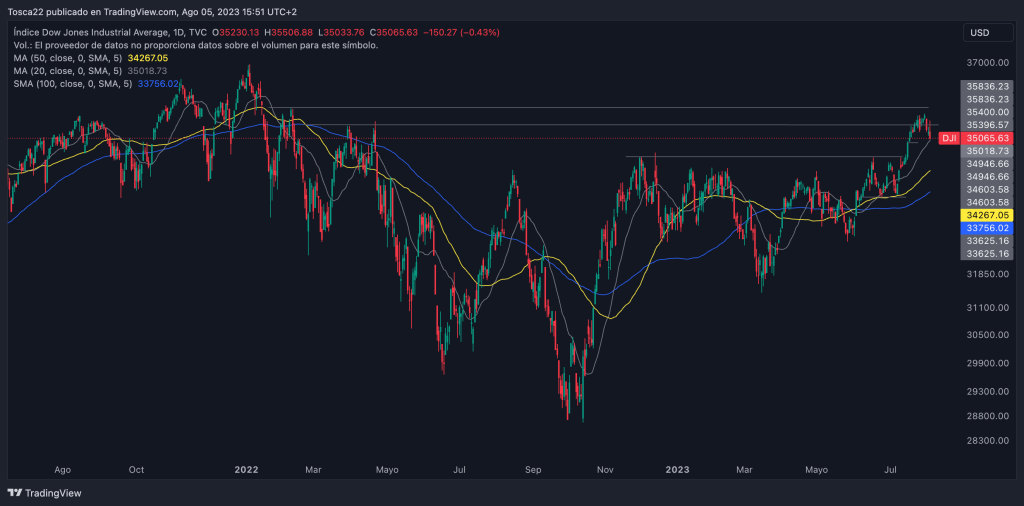 El índice Dow Jones ha experimentado una corrección reciente, al no poder mantener el importante soporte de los 35,400 puntos, lo que llevó a su perforación y lo ha dirigido hacia otra resistencia clave en los 34,980 puntos. En caso de que este soporte también sea perforada, podríamos presenciar una caída adicional hasta los 34,600 puntos. Por otro lado, si el índice logra mantenerse por encima de los 35,400 puntos, será necesario superar esta barrera para retomar una tendencia alcista.