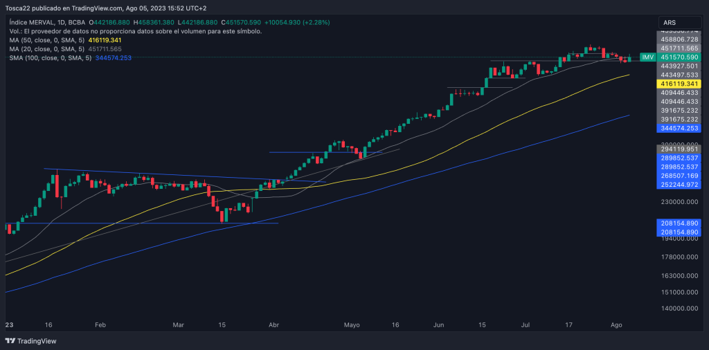 El índice Merval en pesos se encuentra actualmente en el nivel de soporte de los 443781 puntos. Ha realizado dos intentos fallidos de superar la resistencia clave en los 459634 puntos, necesaria para mantener la tendencia alcista. Si el índice perfora el soporte de los 443781 puntos, es probable que tenga una corrección adicional hasta los 409357 puntos.