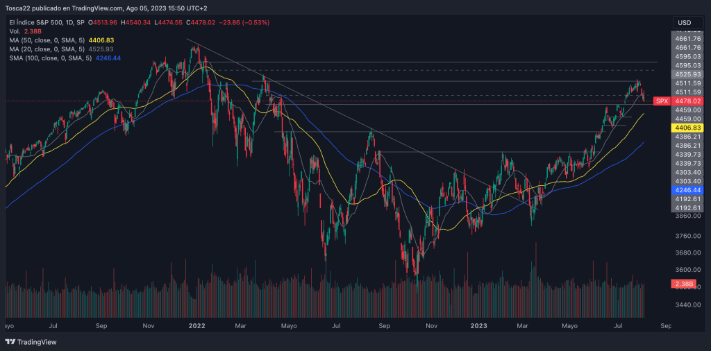 El índice S&P 500 enfrenta un desafío en su camino alcista, al no lograr superar los 4595 puntos y ceder el soporte de 4510 puntos. Actualmente, se encamina hacia los 4460 puntos, y de persistir la presión bajista, podría dirigirse a los 4385 puntos. Sin embargo, para retomar la tendencia alcista, será crucial superar la resistencia de 4510 puntos.