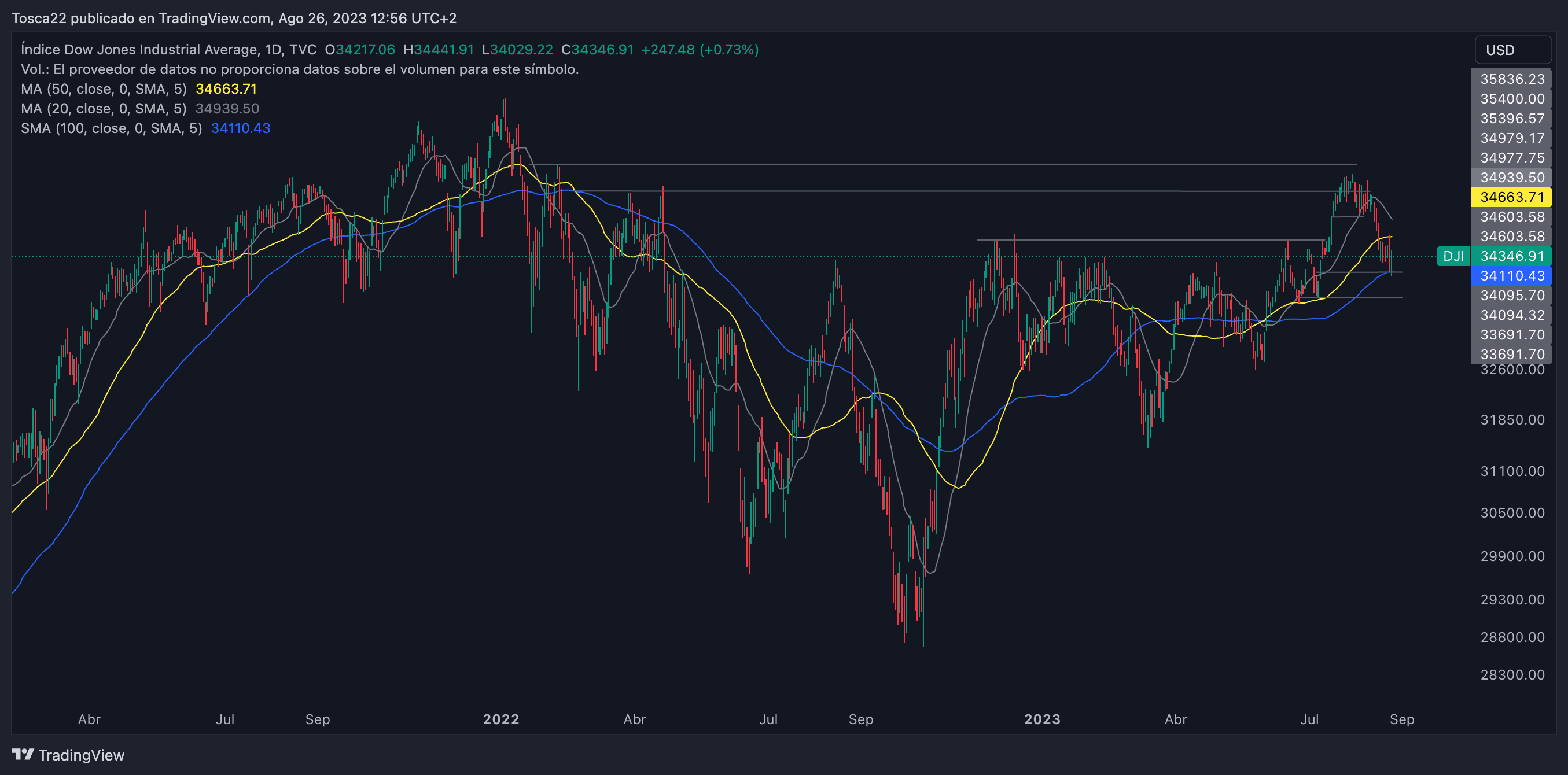 El índice Dow Jones ha experimentado un retroceso que lo condujo hasta el nivel de soporte en 34095 puntos. En caso de que este nivel sea perforado, podríamos presenciar una caída adicional hasta los 33687 puntos. Por otro lado, si el índice logra mantenerse por encima de este soporte, será crucial superar los 34600 puntos para iniciar una posible recuperación alcista, seguida por la necesidad de romper la resistencia en 34980 puntos para fortalecer aún más esta tendencia ascendente.