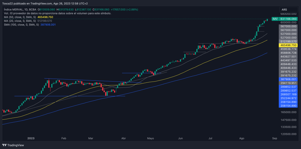 El índice Merval en pesos sigue estableciendo nuevos máximos, alcanzando un nivel de 631166 puntos. En caso de retroceso, cuenta con un soporte en la zona de 566882 puntos.
