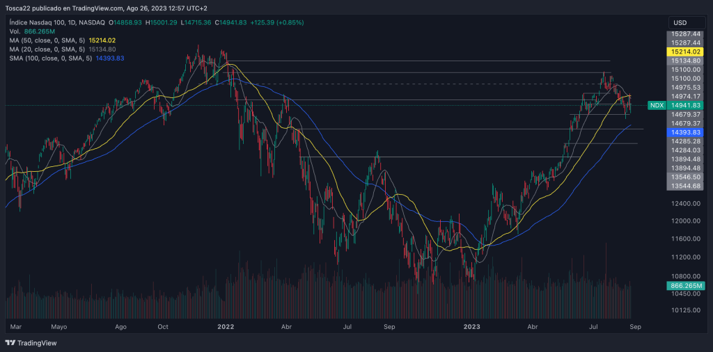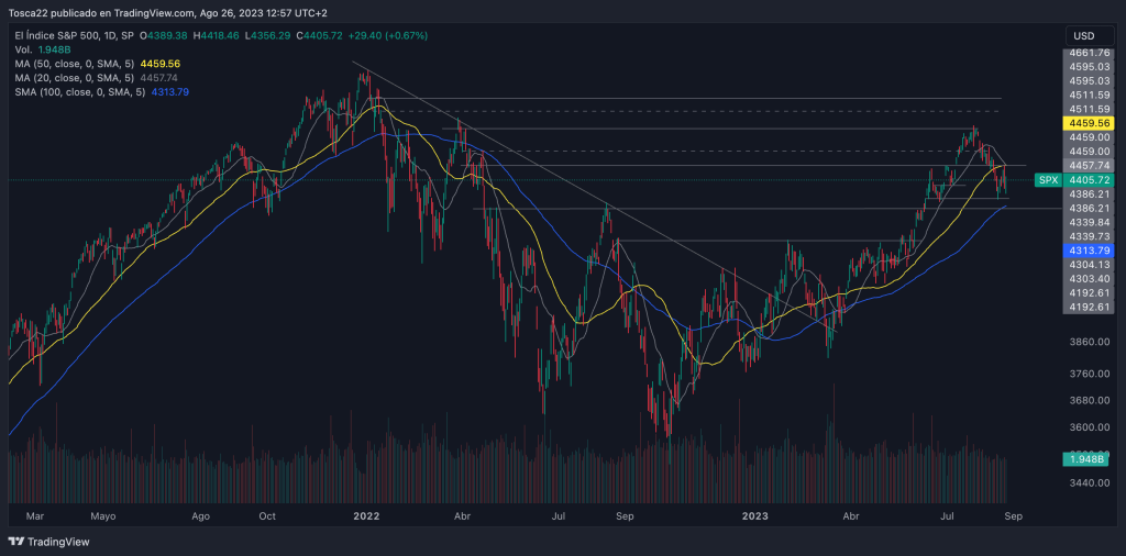 En relación al índice S&P 500, se observa un rebote en la zona de 3340 puntos, seguido de un retorno hasta la resistencia en 4458 puntos y posteriormente un retroceso. Es de gran importancia que el índice logre mantener el nivel de soporte en 4340 puntos, ya que esto permitiría la consolidación de un piso sólido. En caso de que este soporte no sea mantenido, el siguiente nivel de respaldo se encuentra en 4300 puntos.