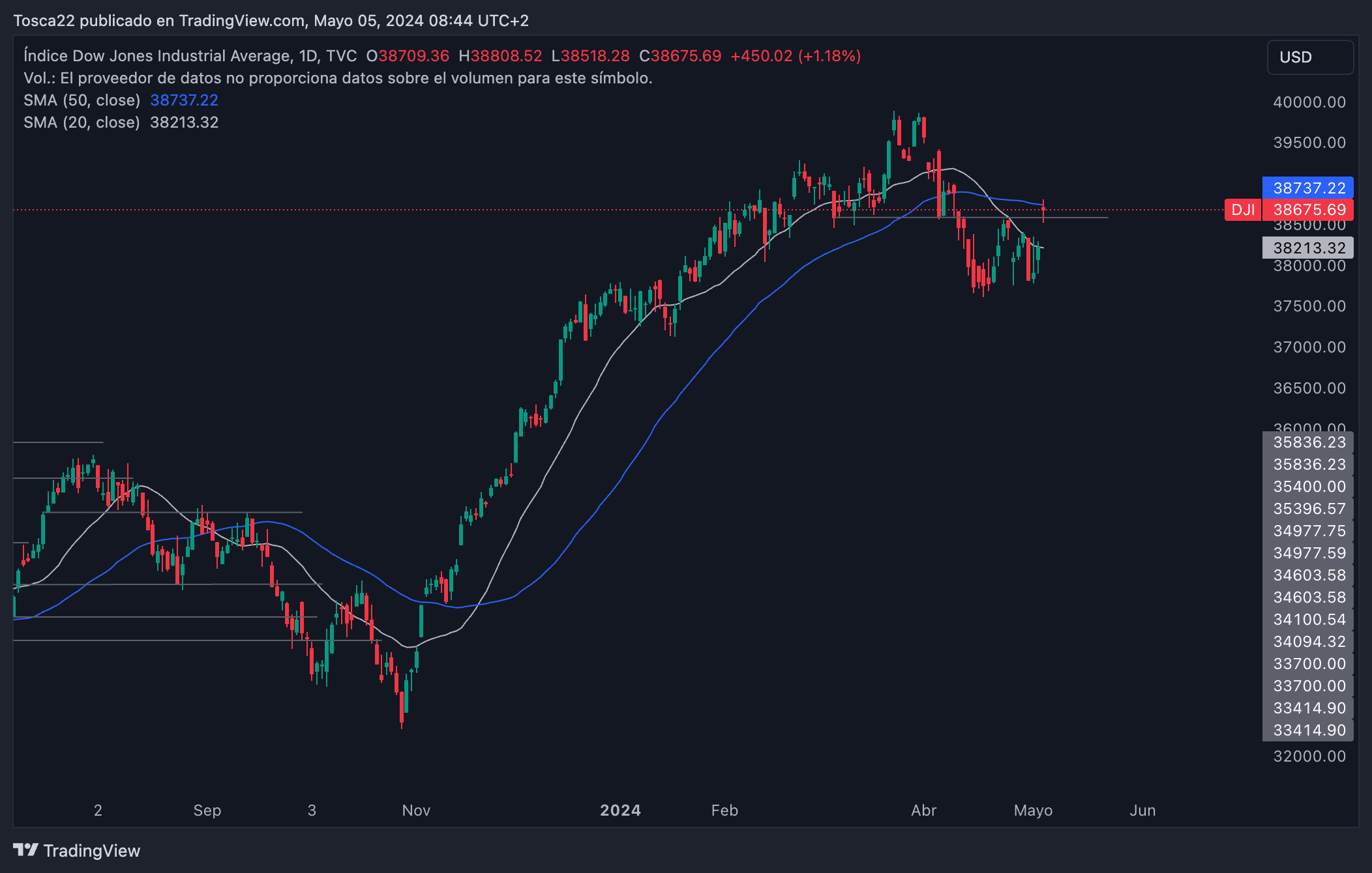 En caso de que el Dow Jones no logre mantener esta resistencia convertida en soporte, existe la posibilidad de una corrección a la baja, con un primer nivel de soporte identificado en los 37,800 puntos. La pérdida de este nivel sería un indicador preocupante, sugiriendo un cambio potencial hacia una tendencia bajista más pronunciada.