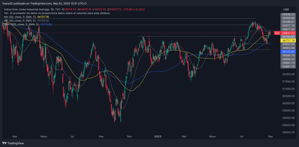 El índice Dow Jones ha conseguido romper la resistencia de los 34,600 puntos y actualmente está haciendo un intento por superar la siguiente resistencia en los 34,978 puntos. En caso de lograr este avance, la próxima resistencia relevante se ubica en los 35,416 puntos. Sin embargo, si no consigue superar esta resistencia, podríamos ver un retroceso hacia la zona de los 34,600 puntos una vez más.