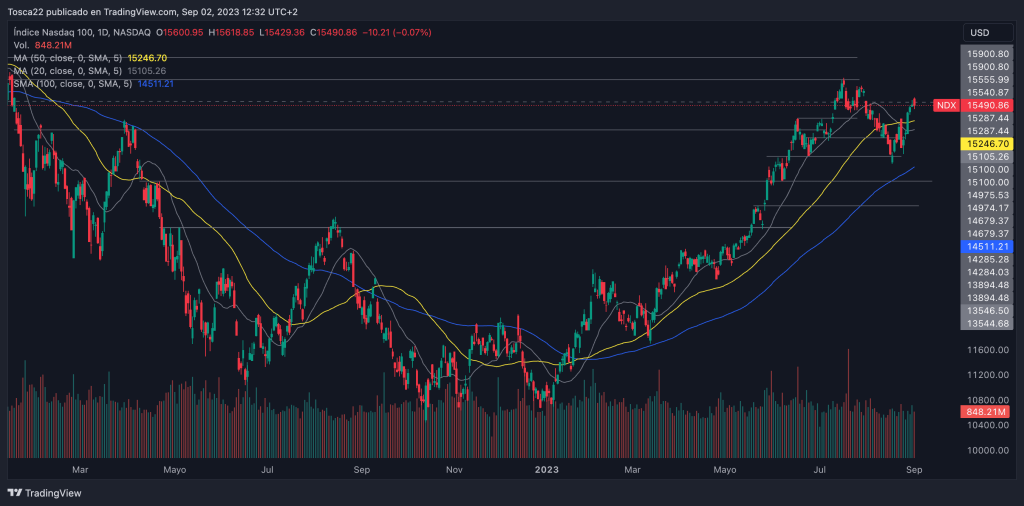El índice Nasdaq 100 ha logrado superar la resistencia de los 15,292 puntos y actualmente se encuentra en la resistencia de los 15,539 puntos. En caso de no lograr superar esta resistencia, podría retroceder nuevamente a la zona de los 15,292 puntos. Sin embargo, si continúa avanzando, el siguiente objetivo estaría en los 15,800 puntos y luego en los 16,257 puntos.