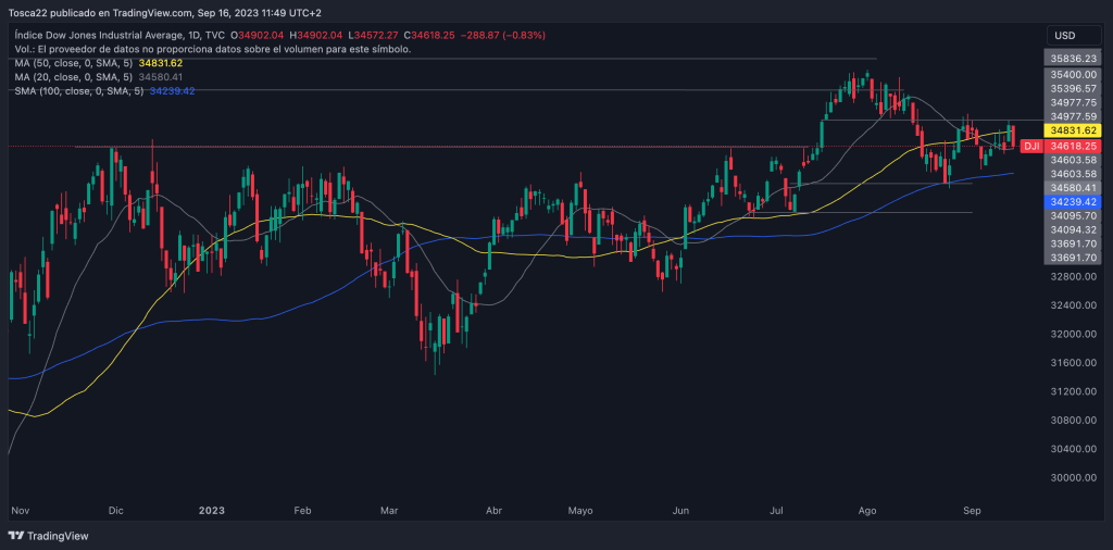 El índice Dow Jones no ha logrado superar la resistencia de los 34,980 puntos, lo que sugiere que posiblemente se dirija hacia el soporte de los 34,295 puntos. En caso de perforarlo, podríamos presenciar una caída adicional hasta los 34,095 puntos.