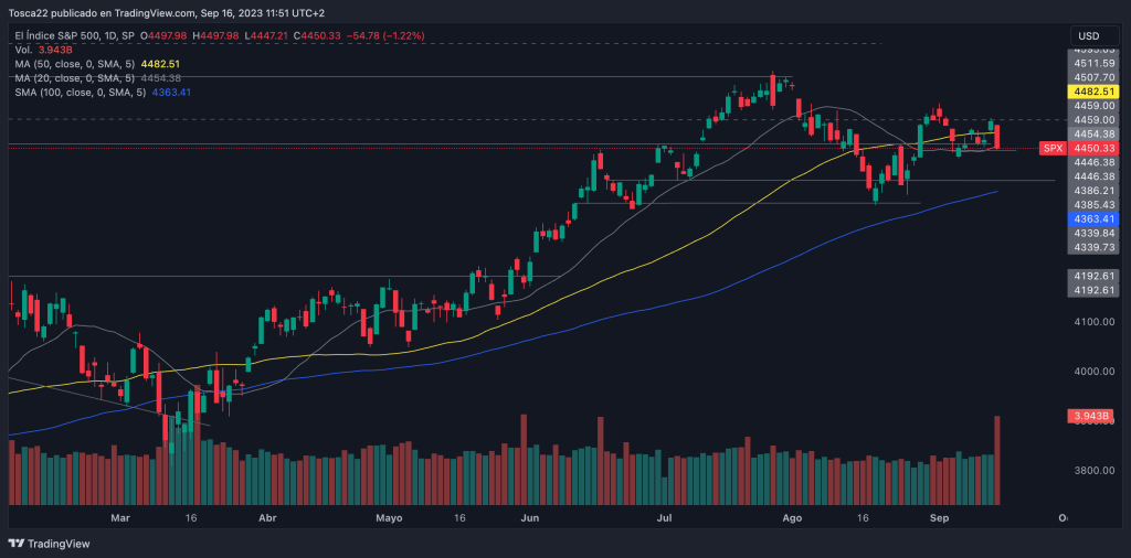 El índice S&P 500 no ha logrado superar la resistencia de los 4,508 puntos y actualmente se encuentra cerca del soporte de los 4,445 puntos. En caso de que este soporte sea perforado, es probable que el índice se dirija hacia los 4,385 puntos. Por otro lado, si el índice rebota y logra superar la zona de los 4,508 puntos, podría dirigirse hacia los 4,550 puntos.