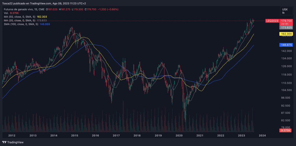 El gráfico ilustra claramente que los precios de la ganadería en Estados Unidos continúan en una tendencia alcista, estableciendo nuevos máximos históricos.